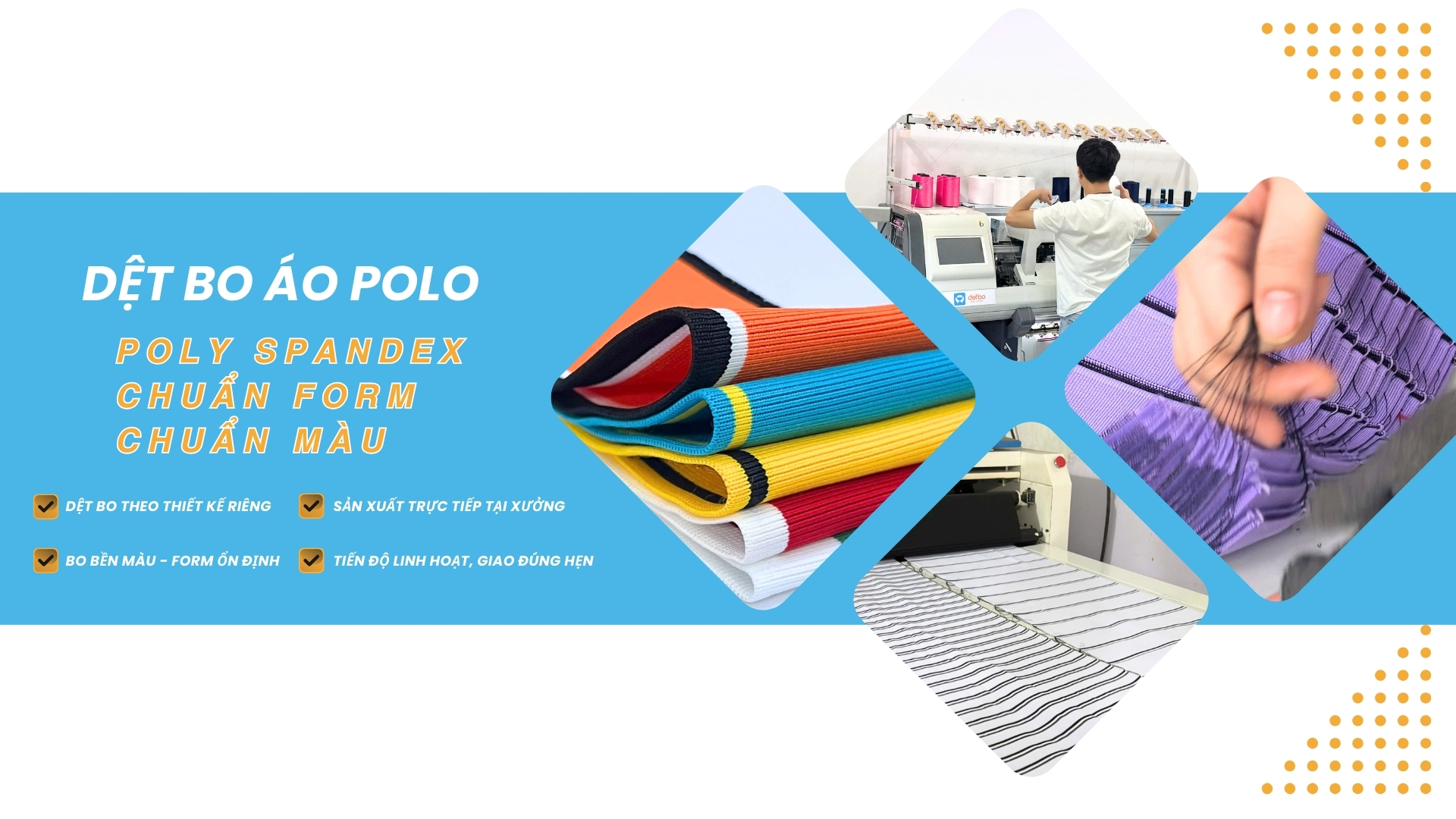Xưởng dệt bo áo polo chuyên Poly Spandex, thiết kế bo theo yêu cầu B2B, giữ form bền màu, chuẩn kỹ thuật cho đồng phục